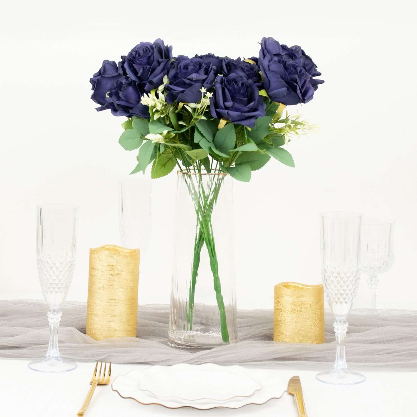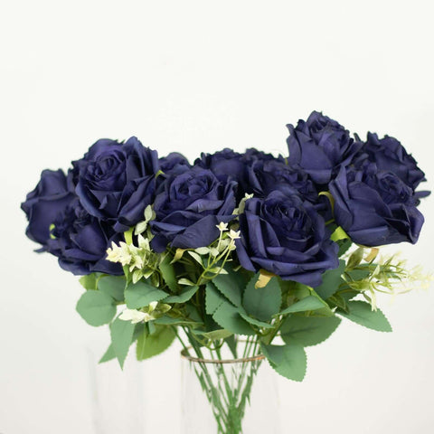 2 Bushes Navy Blue Silk Rose Bouquets – Real Touch Long Stem Artificial Flowers 18"